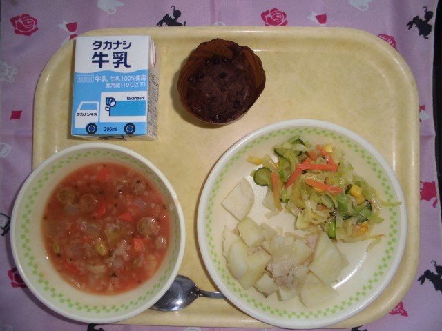 牛乳 トマトリゾット ジャーマンポテト グリーンサラダ ブラウニー