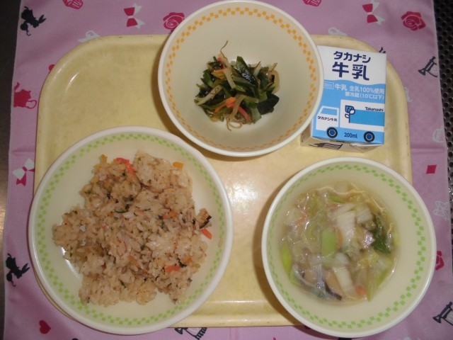 牛乳 キムチチャーハン 海藻サラダ はるさめスープ