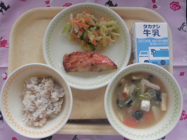 牛乳 おかかじゃこごはん 金目鯛の香味焼き 和風サラダ 具だくさんみそ汁
