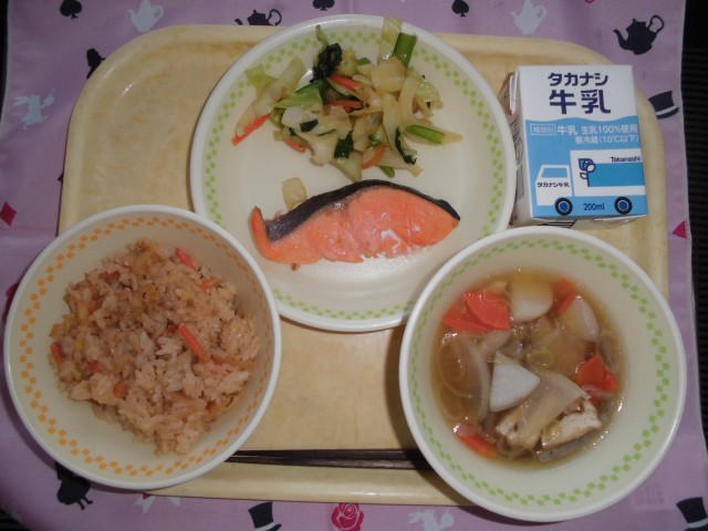 牛乳 キムたくごはん 鮭の塩焼き おろしあえ のっぺい汁