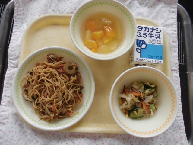 牛乳 ソースやきそば 元気サラダ フルーツポンチ