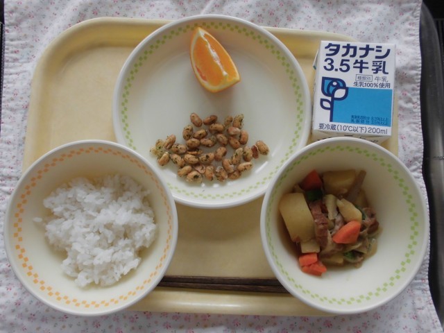 牛乳 ごはん 青のりビーンズ 肉じゃが 果物(清見オレンジ)