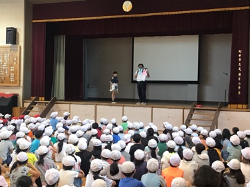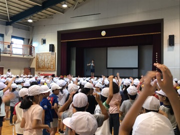 今日は、雨天のため、急遽体育館にて体育朝会を行いました。