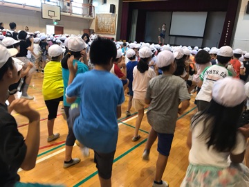 今日は、雨天のため、急遽体育館にて体育朝会を行いました。