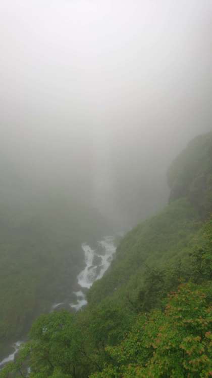 華厳の滝は濃い霧に囲まれ、
