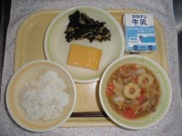 牛乳 根コンごはん 小松菜と油揚げの煮びたし みそけんちん汁 果物(みかん)