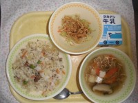 牛乳 五目チャーハン 揚げごぼうのサラダ 中華スープ
