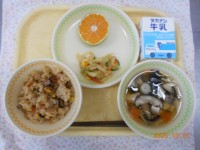 牛乳 中華おこわ 味噌ドレッシングサラダ 豆腐のすまし汁 果物(みかん)