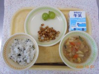 牛乳 わかめごはん 豆かりんとう じゃがいものみそバター煮 果物(シャインマスカ...
