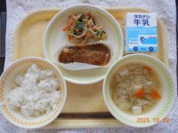 牛乳 ごはん ホキの麦みそ焼き もやしナムル 白菜と豆腐のスープ