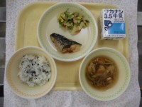 牛乳 わかめごはん さばの塩焼き みそドレッシングサラダ 沢煮椀