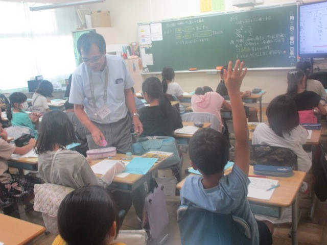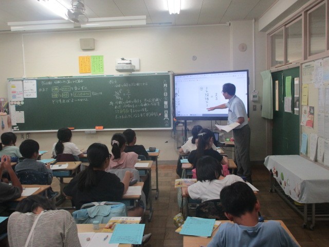 1組の6時間目の算数は、大きさの等しい分数について考える授業です。約分の意味とその仕方について、既習事項を使って考えを整理しながら理解を深めていました。最大公約数を使って約分することの意味を理解し、授業の振り返りもしっかりできました。