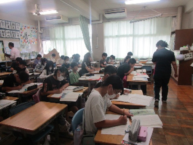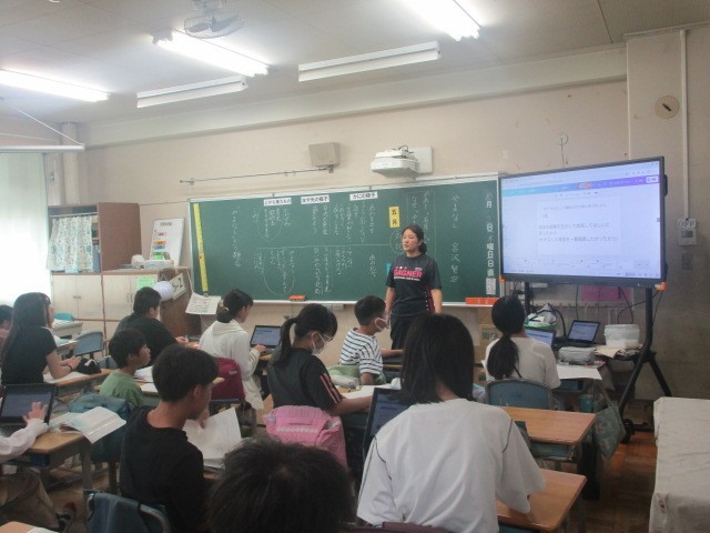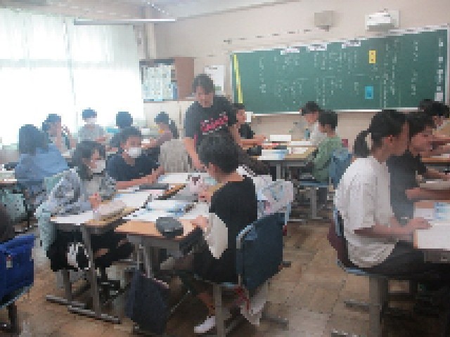 1時間目の2組の国語は、「やまなし」の単元の学習です。宮沢賢治の「やまなし」の2つの場面を読み比べて、題名となっている「やまなし」について考えます。「五月」と「十二月」の2つの場面から、3つの観点に分けて読み深める中で、前時で取り組んだ資料「イーハトーヴの夢」を参考にしながら、作者の題名に対する思いについて考えることができました。班での話し合いも活発に行われて、宮沢賢治の作品の世界をしっかりとらえることができていました。