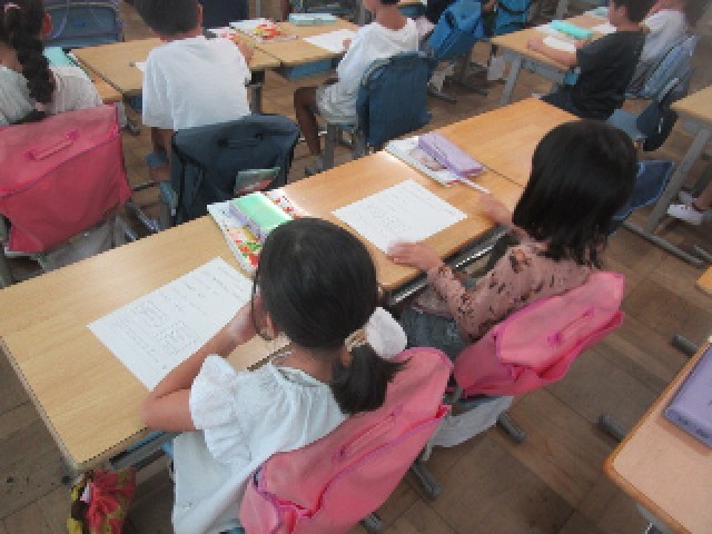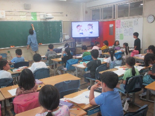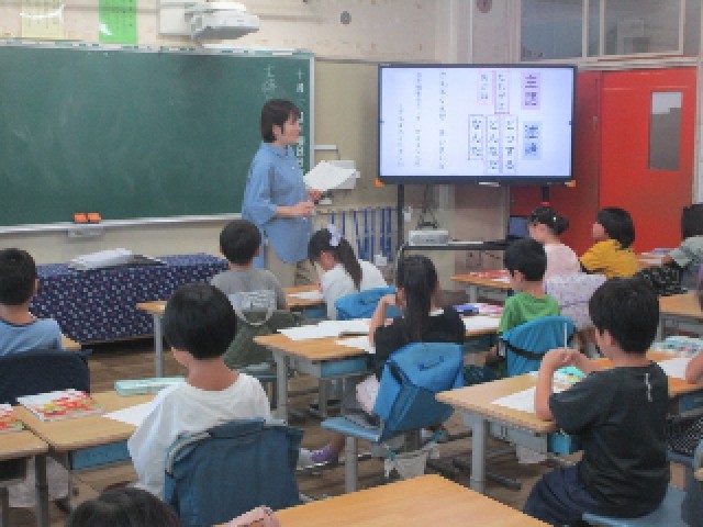 2時間目の2組の国語の授業は、「主語と述語」についての勉強です。「だれは(何が)~どうした。どんなだ。何だ。」という、基本的な文章の構造について学びました。子供たちは先生の発問に積極的に手を挙げて発言し、とても活気のある授業でした。