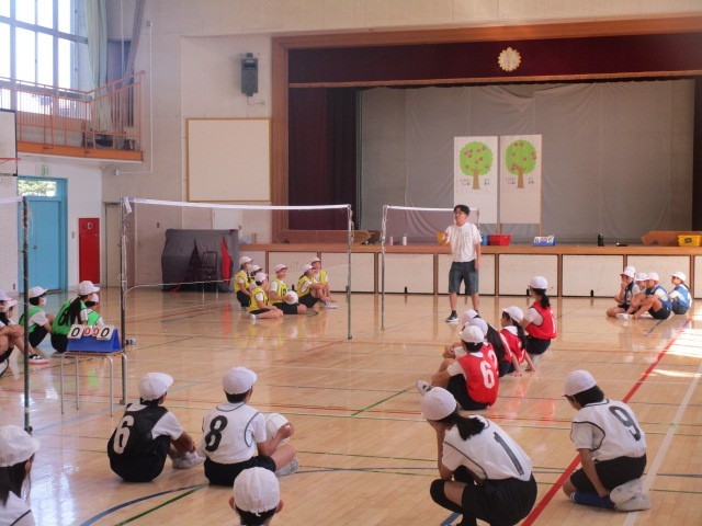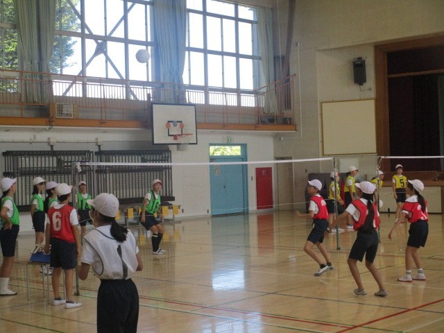 2時間目の体育館では、3組の子供たちがソフトバレーボールの授業です。練習を通してルールを工夫しながら、ゲームの際には全員で確認してから始めます。みんなが活躍できるように、チームで声を掛け合って楽しんでいる様子がうかがえて、とてもほのぼのとした雰囲気でした。