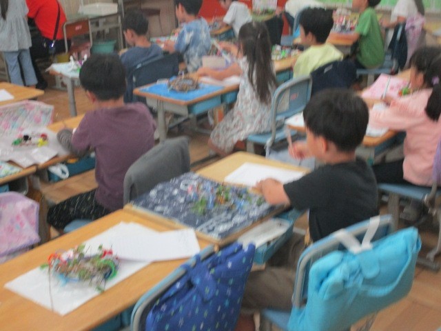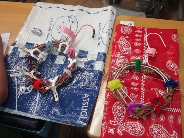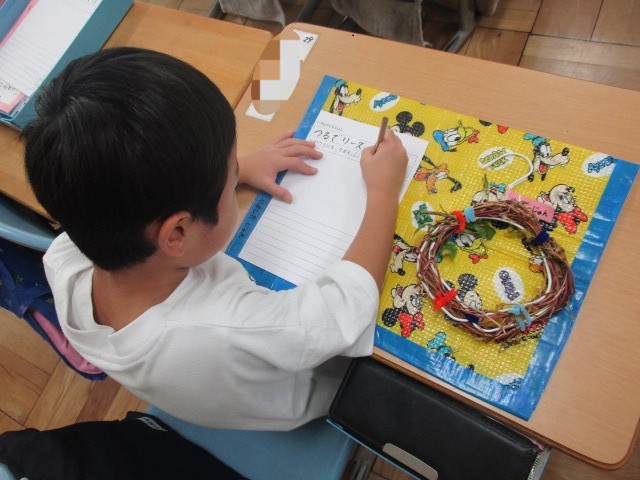 2時間目の1組の教室では、リース作りに一生懸命に取り組む子供たちの姿が見られました。モールや洗濯ばさみなど、いろいろな材料を使って、どれもとてもユニークな作品ばかりです。それぞれでどんな工夫をしたかをカードにまとめていました。