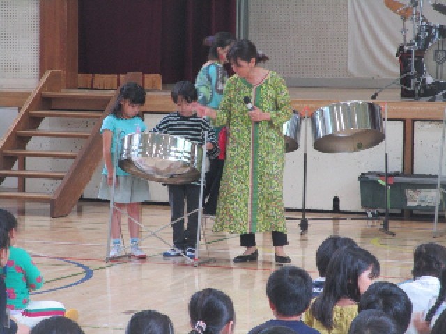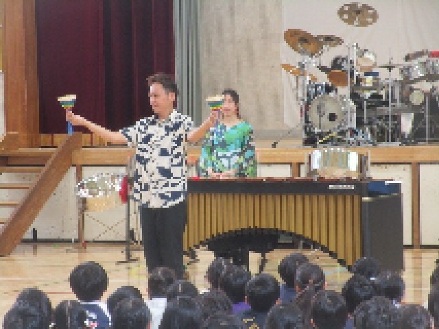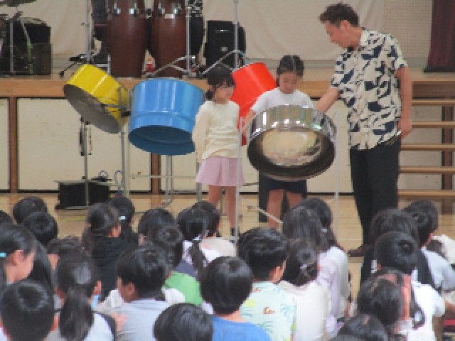 各学年の代表の子供たちによる、楽器の体験もさせてもらいました。いろいろな音色の打楽器が紹介され、子供たちは夢中になってゲストティーチャーの演奏を聴いていました。