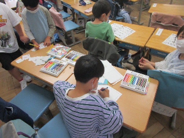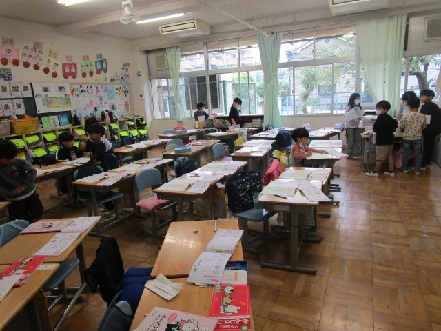 今日は朝から雨が降ったり、やんだりしていてはっきりしない天気になりました。昼休みの1年生の教室では、子供たちが絵を描いたり、プリントをやったりして静かに過ごしていました。明日は外で遊べるといいですね。
