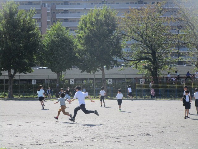 青空の広がる昼休みの校庭では、子供たちがのびのびと休み時間を楽しんでいます。鬼ごっこをしたり、ボール遊びをしたりと、それぞれ思い思いに過ごしています。今日は朝から気温がぐんぐん上がり、少し汗ばむ陽気になりましたが、それでも子供たちはみんな楽しそうに休み時間を満喫していました。
