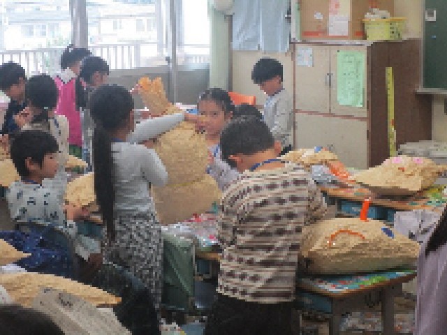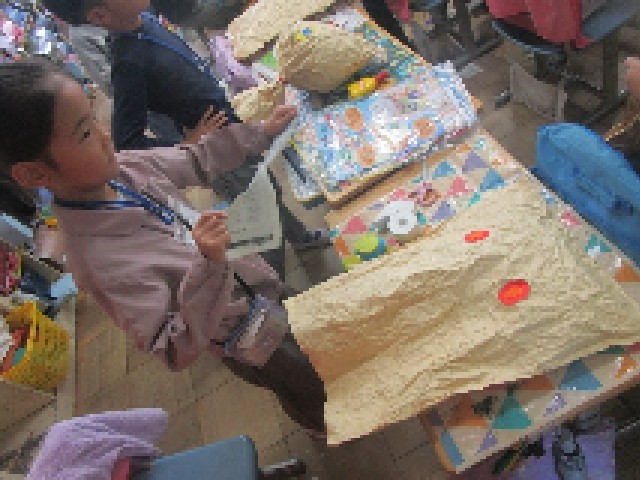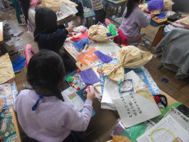 3・4時間目の3組の図工の授業は、『ぎゅっとしたい!わたしの「友だち」』の課題で、大きなクラフト紙の袋をぐしゃぐしゃにして、その中に新聞紙を切って詰めて、思わず抱きしめたくなるような自分だけのキャラクター(=「友だち」)を作ります。子供たちは、色や形、いろいろな材料の使い方を工夫し、紙を丸めたり、くしゃくしゃにしたりする感触を楽しみながら、立体的な作品を生み出します。どんな「友だち」ができるか、とても楽しみな活動になっていました。