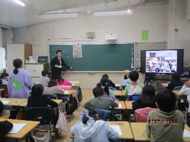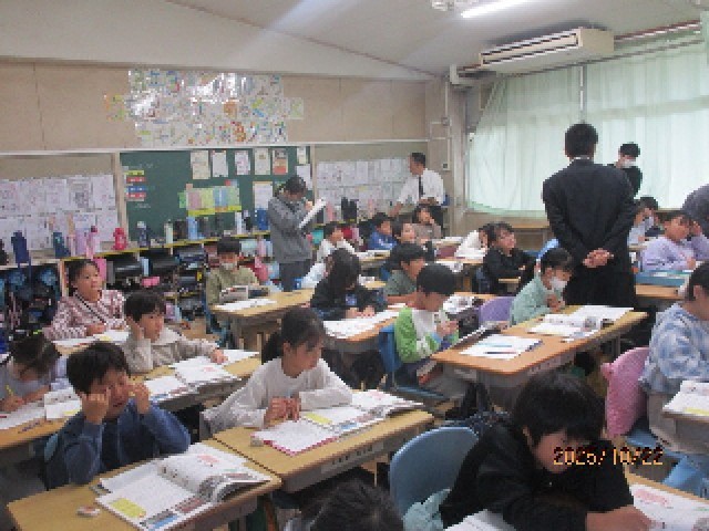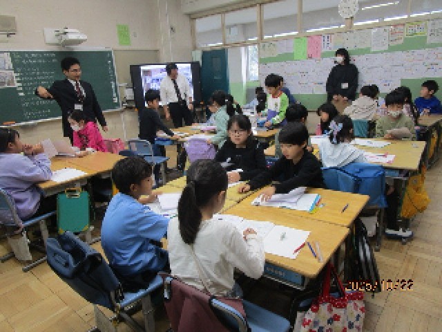 1時間目の3組の教室では、先週参加したスーパーマーケット見学をもとに、気づいたことやさらに詳しく調べたいことを考える授業が行われました。写真や記録カードをもとに、友達と意見を交わしながら学びを深めていました。教育実習の先生方も授業を参観し、自分の指導に生かそうと学んでいました。