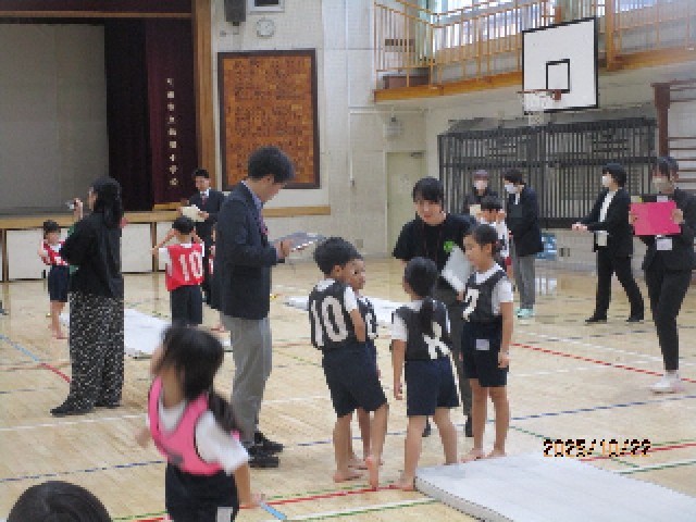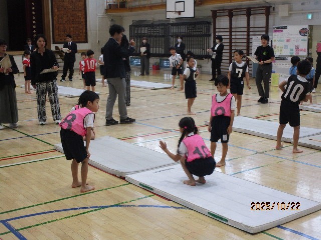 今回は「マットを使った運動遊び」の単元の学習です。マットをみんなで協力して準備した子供たちは、準備運動も入念に行います。わくわくタイムでは、グループの友達同士で演技を見合いながらアドバイスや意見を伝え合い、自分の動きを確かめました。