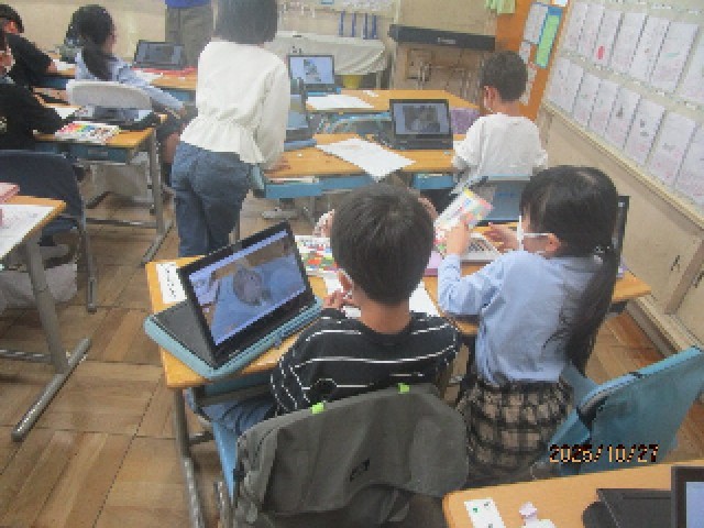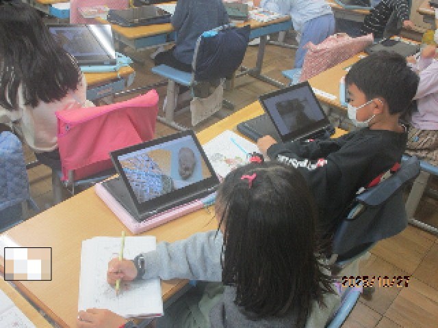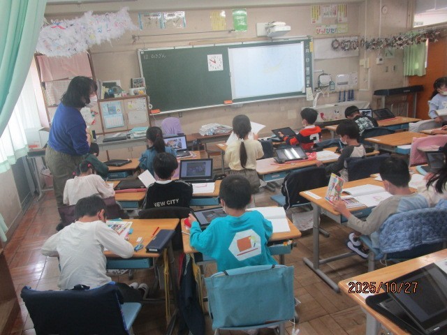 2組の4時間目の生活科の授業は、「あきを見つけよう」の学習で、それぞれに興味をもって探してきた秋の動植物についてまとめます。タブレットで撮影したものを見ながら、ノートに整理しました。一生懸命に映像を見ながら、どんなところに秋を感じるかについて考えます。春や夏と比較して、どんなところが違うかを考え、自然の不思議さに気づくことができたようです。