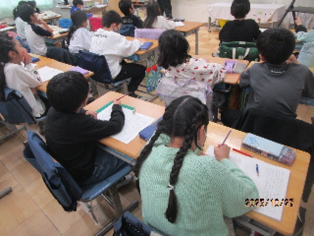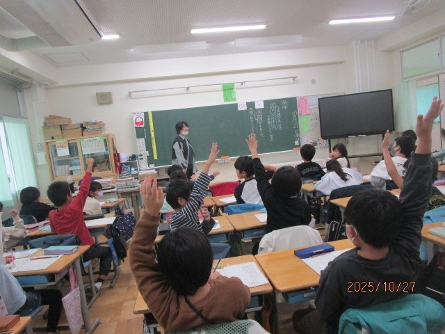 2組の国語の授業は、「修飾語を使って書こう」の単元の学習です。文章を構成する主語と述語の関係を復習した後、それぞれの言葉を詳しくする言葉である修飾語について考えました。先生の提示する絵を見ながら、より分かりやすい文章にするためにはどうしたらよいかを考えながら、自分の意見を積極的を発表していました。