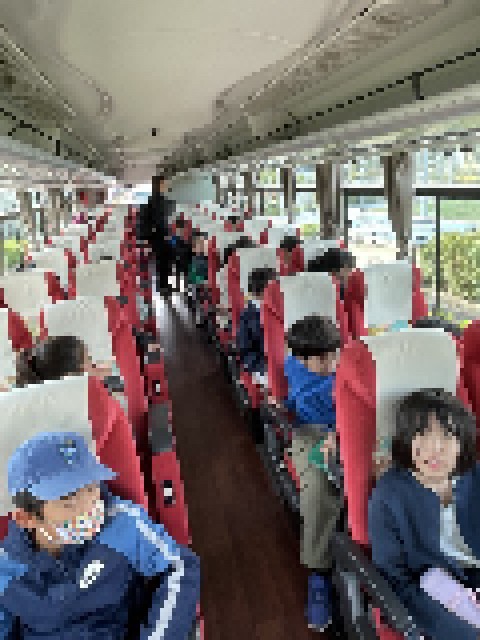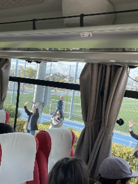 バスに乗り込み、シートベルトをつけます。お見送りに来ていただいたお家の方々や先生に手を振って、バスは一か所目の目的地の宮ヶ瀬ダムに向かいます。