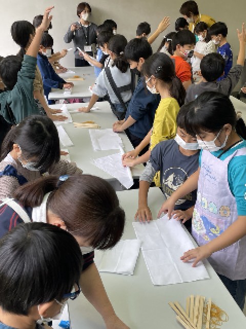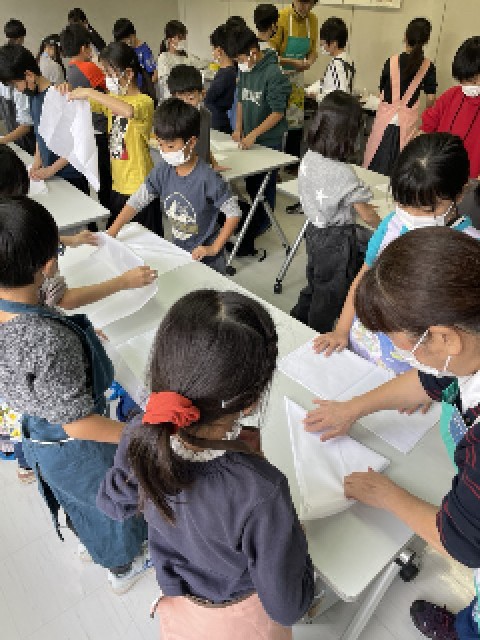染め出す模様を事前に決めている子供たちは、布を畳んだり、割り箸と輪ゴムでくくったりと、それぞれ苦戦しながらも、友達同士で助け合う姿が見られてすてきでした。