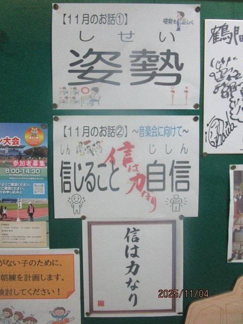 特に2つ目は、今週末の音楽会に関わります。子供たちはお家の方にどんな内容だったか、説明してみてください。ぜひ、ご家庭でも子供たちのお話を聞いてあげて、今週の音楽会に向けて、励ましの言葉がけをお願いします。