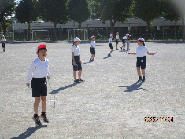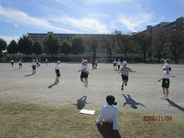 1組の体育は、校庭でのなわとびの授業です。青空のもと、子供たちはグループで見合いながら、なわとびカードの技を練習していました。校内は音楽会モードですが、子供たちは体力向上にも一生懸命に取り組んでいます。