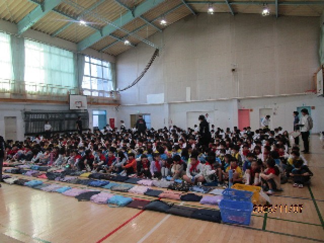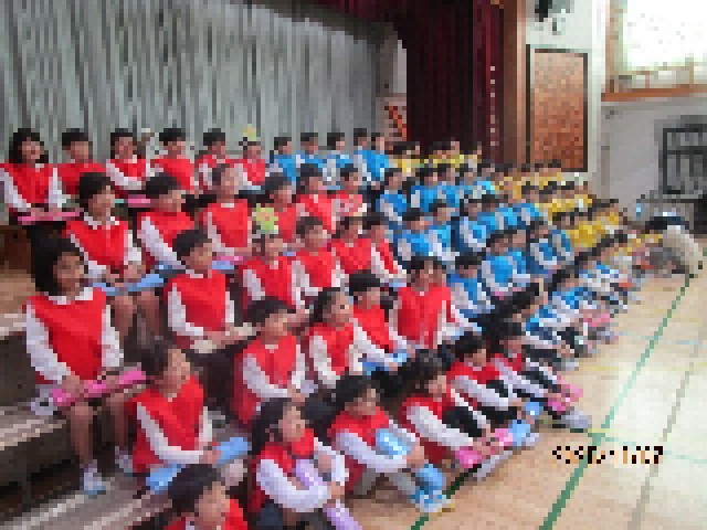 8時30分、体育館には子供たちが順番に入場してきました。トップバッターの1年生は、すでに舞台に並んで開会を待っています。緊張感が伝わってきます。
