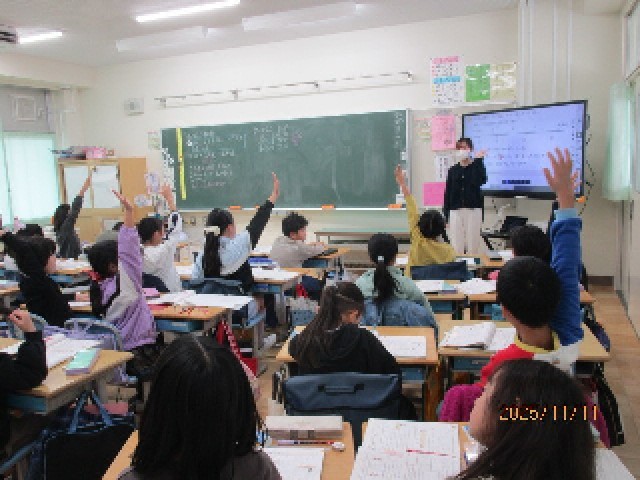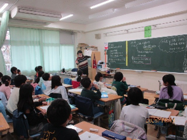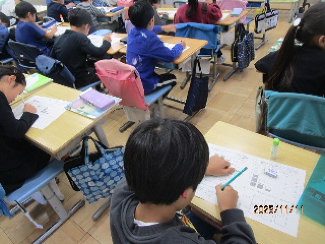 午後5時間目の3年生は、算数少人数の授業で「小数」の学習です。小数の相対的な大きさについて理解を深める学習です。数直線など視覚的にとらえたり、0.1の何個分で表したりするなど、いろいろな問題に当たりながら知識の整理をしていました。算数の授業も少しずつ難しくなってきましたが、3年生はがんばっています。