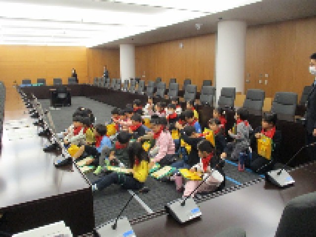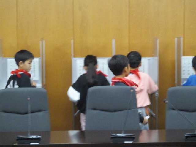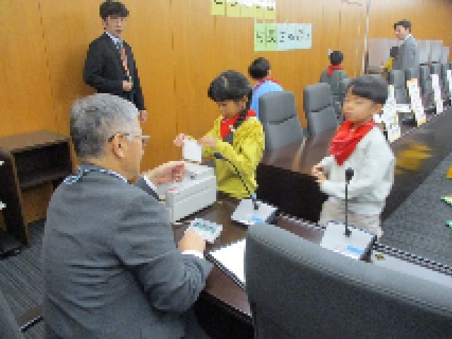 市役所の中を見学したうえで、いつかの体験活動を行いました。1つ目は選挙体験です。選挙のしくみについてお話を聞き、実際に使用している投票用紙を使って候補者の名前を書いて投票しました。
