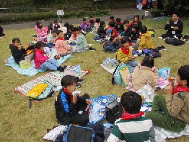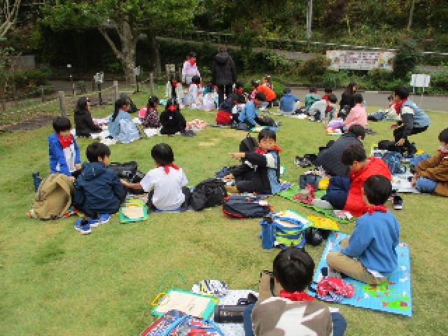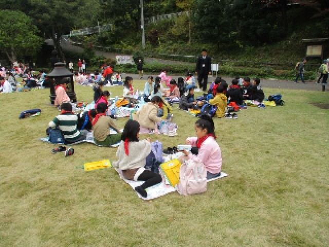 午前の市役所見学を終えた3年生は、バスで薬師池公園に移動しました。楽しみなお弁当の時間です。愛情のこもったお弁当を、班でそろっていただきます。早朝から準備していただき、ありがとうございます。