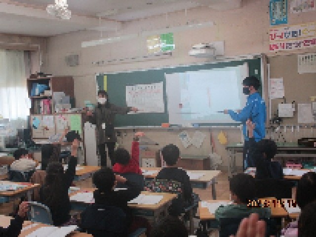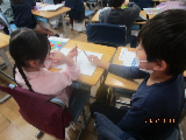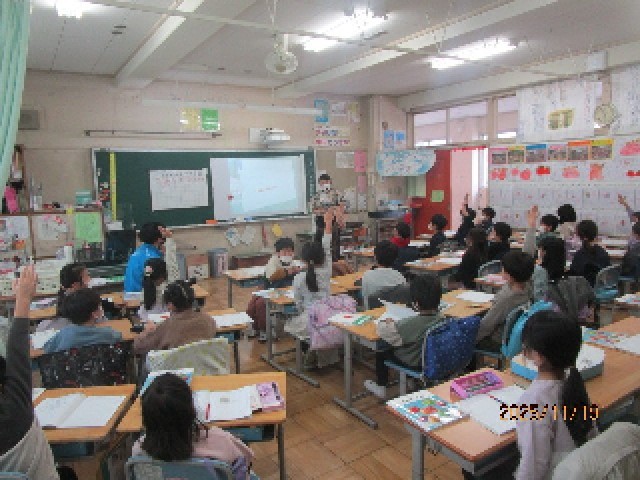 3時間目の1組は、算数の授業で「くらべてみよう」の学習です。2つの物の長さを比べる課題に取り組みました。身近にある鉛筆や長縄の長さを、正確に比べる方法を考えます。先生の発問に一生懸命に答える子供たちは、どの子もみんなしっかり学習内容が理解できているようでした。