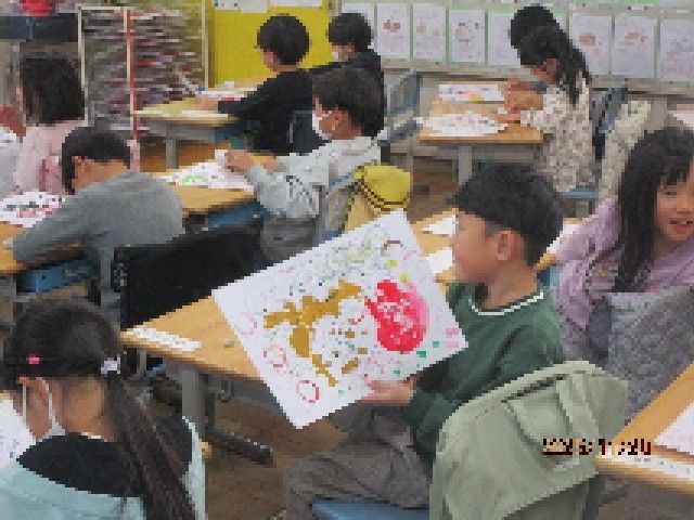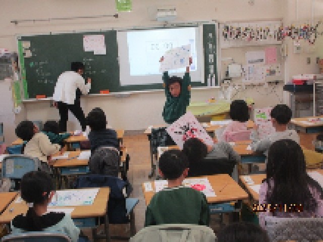 3組の教室では、図工の時間に仕上げた、「さわって まぜて きもちいい」の課題の作品に名札をつけて、友達同士で作品紹介を行っていました。手や指、いろいろな物を使って、絵の具で描いた作品で、自分なりに工夫したところやがんばったところなど、みんなの前で発表します。お友達の作品の良さに気づき、称賛する姿に、1年生の成長を感じました。