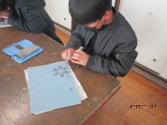 1組の3・4時間目の図工は、「葉っぱのファンタジー」の題した木版画の課題に挑戦です。彫刻刀を上手に使って、細かい模様を彫っていました。どの子も手元をしっかり見ながら、ケガをしないように慎重に彫り進めていました。
