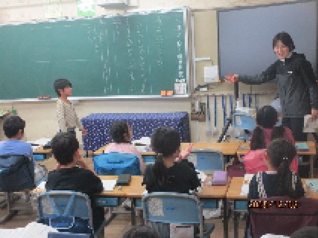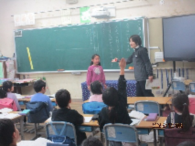 2組の3時間目の国語は、「みきのたからもの」の単元の学習です。物語を読んで、場面ごとの様子についてみんなで考えます。先生は作中の「おそるおそる」という言葉に注目させ、子供たちに主人公の思いについて話し合わせていました。子供たちも実際に動きで表現しながら、物語の世界を体感するなど、生き生きとした授業が展開されていました。