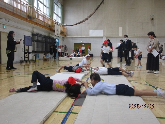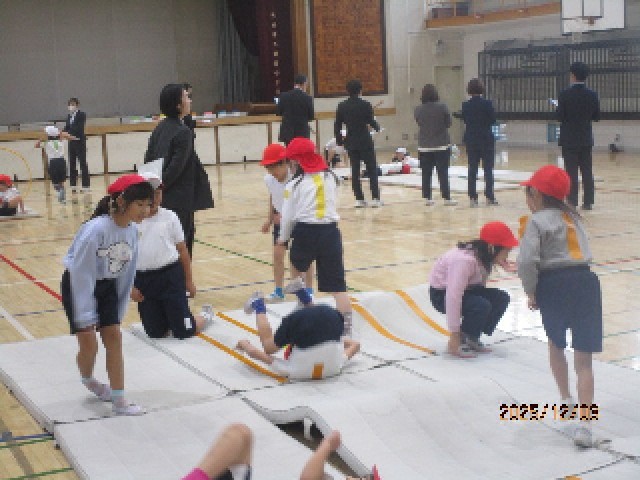 「にんにんタイム」では、グループで考案した遊びで、みんなで共有したい技を紹介します。発表を見たうえで、さらに遊びを工夫したり、技を進化させるなどして、後半の忍術づくりを進めました。
