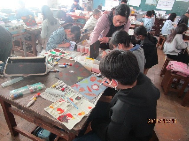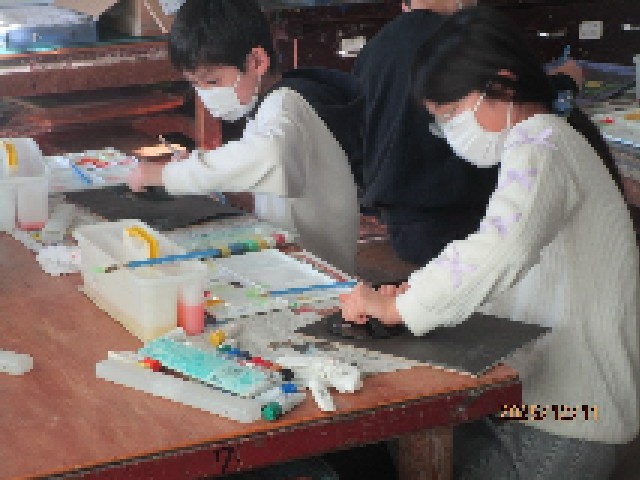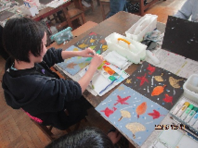 3組の3・4時間目の図工の課題は、「一版多色刷り」の木版画に挑戦です。秋をテーマにした木彫りの板に、色ごとに着色しながら、重ね刷りを繰り返します。赤や黄色などに色づいた秋の紅葉が表現され、すてきな仕上がりになっていました。