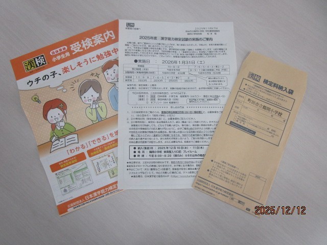 来年1月31日(土)に実施する「漢字検定」の申し込み受付が終了しました。在籍する児童のご家族(保護者・きょうだい)を含めて、200件近くの申し込みがありました。お申込みいただいた際に、領収証(封筒に入れて)を、お子様に渡しておりますので、各ご家庭で必ずご確認いただきますよう、よろしくお願いいたします。