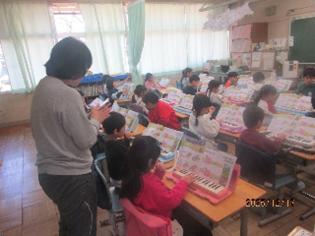 5時間目の2組の教室では、鍵盤ハーモニカのテストが行われていました。2人ペアで課題曲を演奏し、音色や指使いをチェックします。緊張しながらも合格のシールをもらって、子供たちはとてもうれしそうでした。