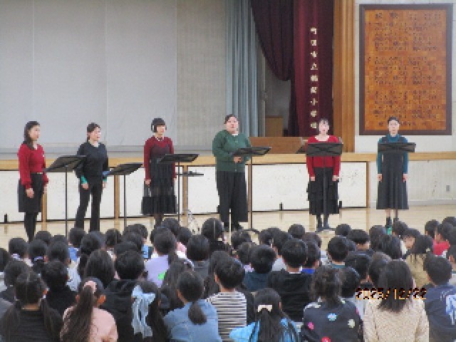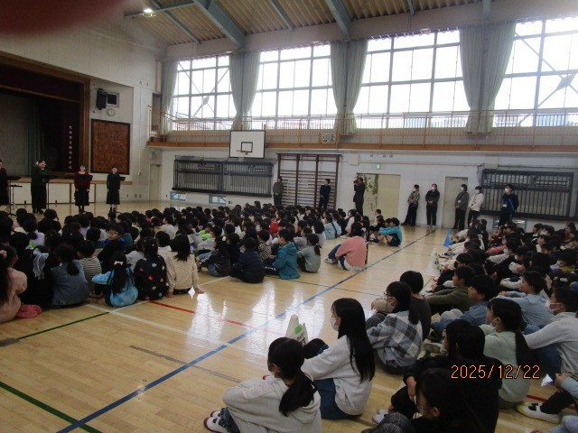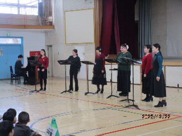 子供たちが体育館に集合し、コンサートが始まりました。音楽の高畑先生もピアノで参加します。曲は、子供たちにも馴染みのある「カントリーロード」と、『アナと雪の女王』より「Let Ⅰt Go~ありのままで~」が披露され、みんなうれしそうに、かつ真剣に聞いていました。