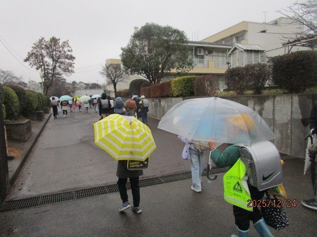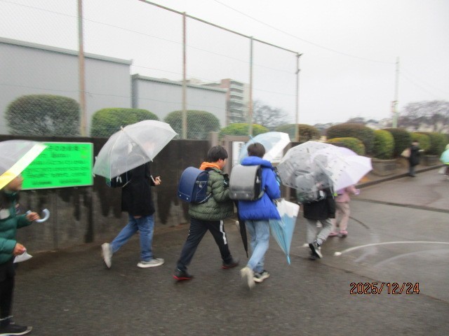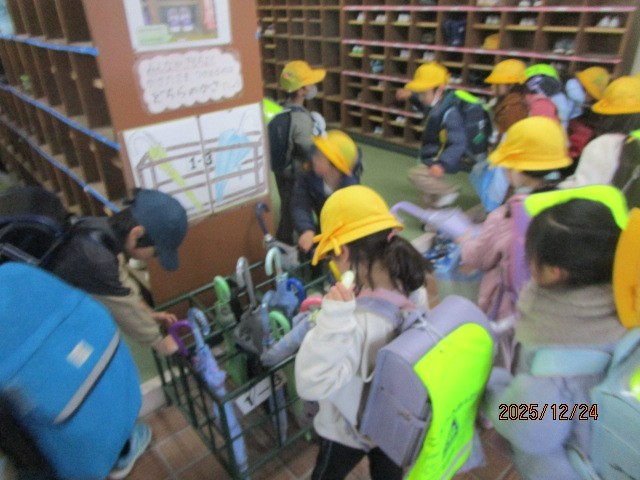 クリスマスイブの朝は、あいにくの雨での登校となりました。幸いなことに小雨で、傘をささずに登校してきた子もいましたが、傘はしっかり束ねて傘立てへ入れます。上手にできるようになったかな?
