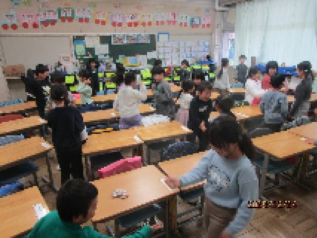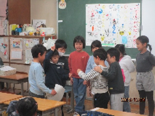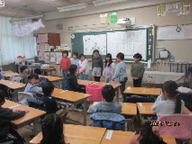 2時間目の2組の教室では、2学期がんばったご褒美として、「がんばったね会」と題したお楽しみ会が催されていました。この日のために、それぞれの役割分担があって、司会やゲーム担当など、それぞれがしっかり準備をして進めていました。みんなで協力ができて、とても楽しい1時間になったようです。