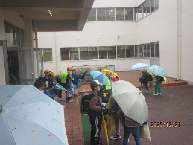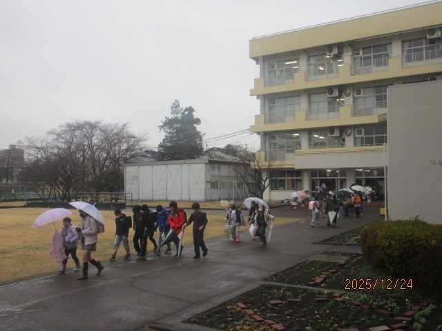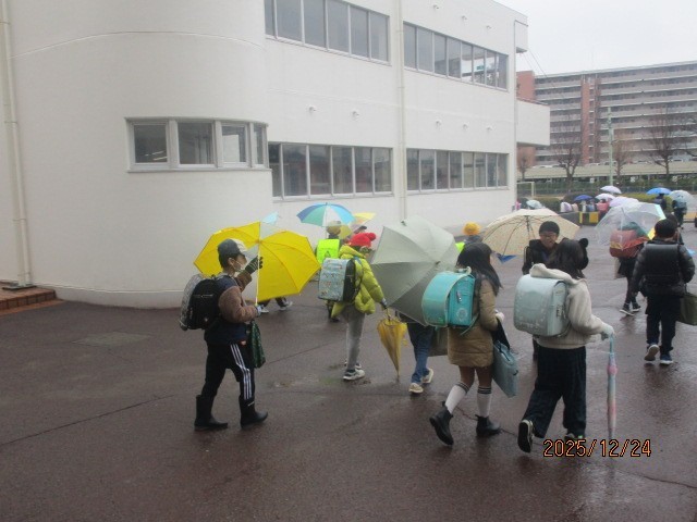 今日と明日の終業式は、B時程の4時間授業で下校となります。小雨が降る中、子供たちが下校の途につきました。手荷物がある子は、道中車などに気を付けて、明日もう1日、元気に登校してきてください。