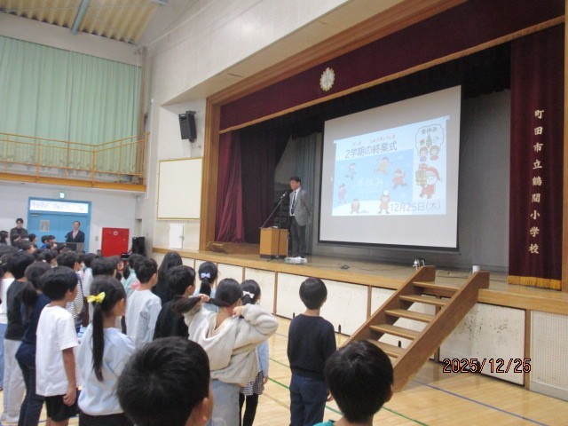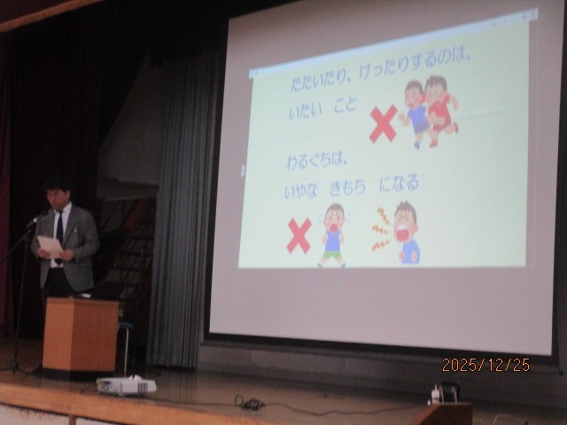 8時30分、全校児童が集合し、2学期の終業式が始まりました。校長先生からは、まず最初に、「学校生活を楽しくすごすために」と題した講話を行いました。子供たちが学校生活の中で、「おかしいな」「モヤモヤするな」「イヤだな」と感じることがないようにするために、学校の先生に相談したり、相談窓口を紹介したりして、一人で悩まないことを、スライドを使って分かりやすく説明しました。このことに関するお手紙(2枚)を、本日児童に配布していますので、ご家庭で必ず確認してください。よろしくお願いいたします。