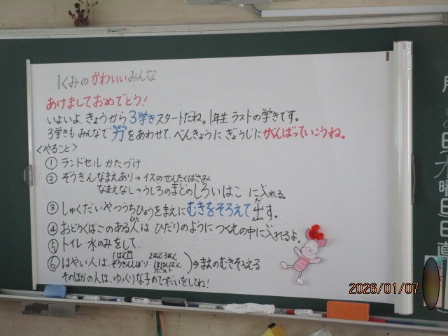 いよいよ明日から3学期が始まります。それぞれの教室では、先生方が子供たちを受け入れる準備を整えて待っています。まだ冬休みの生活のリズムのままの子は、今日は少し早めに休んで、明日の登校に備えてくださいね。